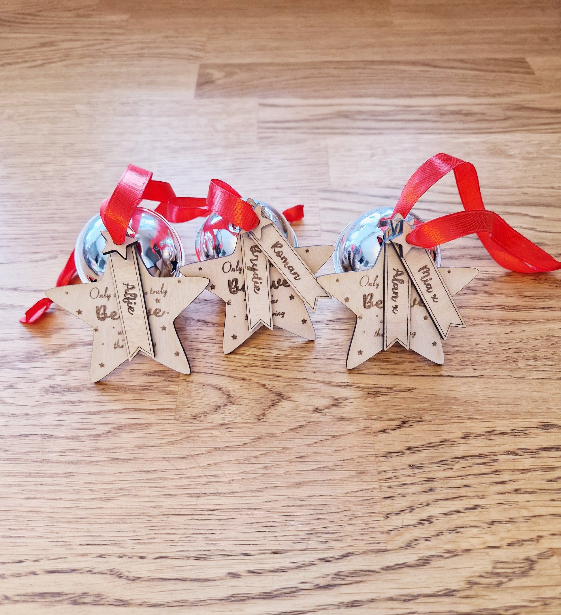 Laser engraved on 3mm birch plywood with a 50mm silver bell and tied with red ribbon.