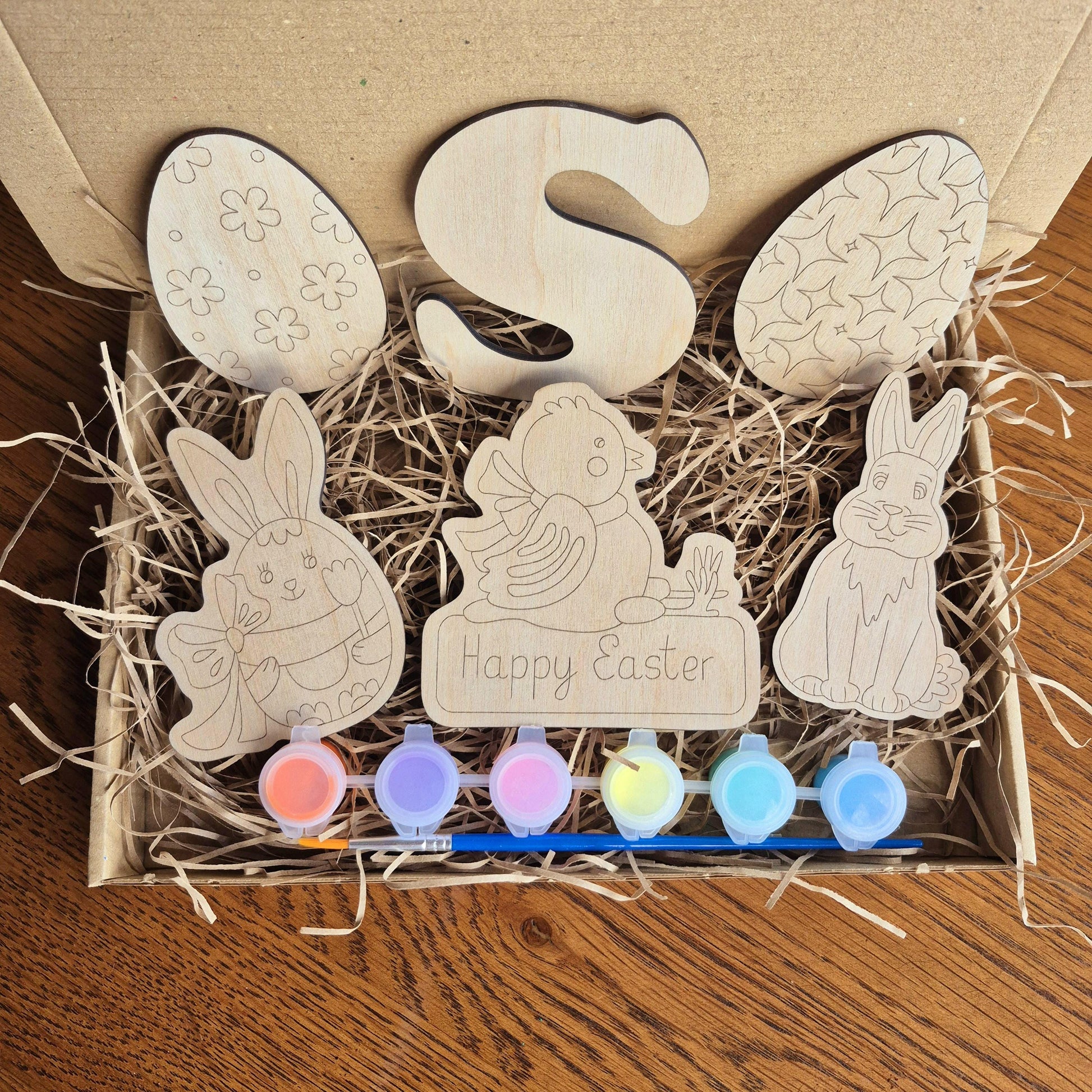 1 kit includes 5 easter shapes and 1 letter 6 paints and a paint brush.
