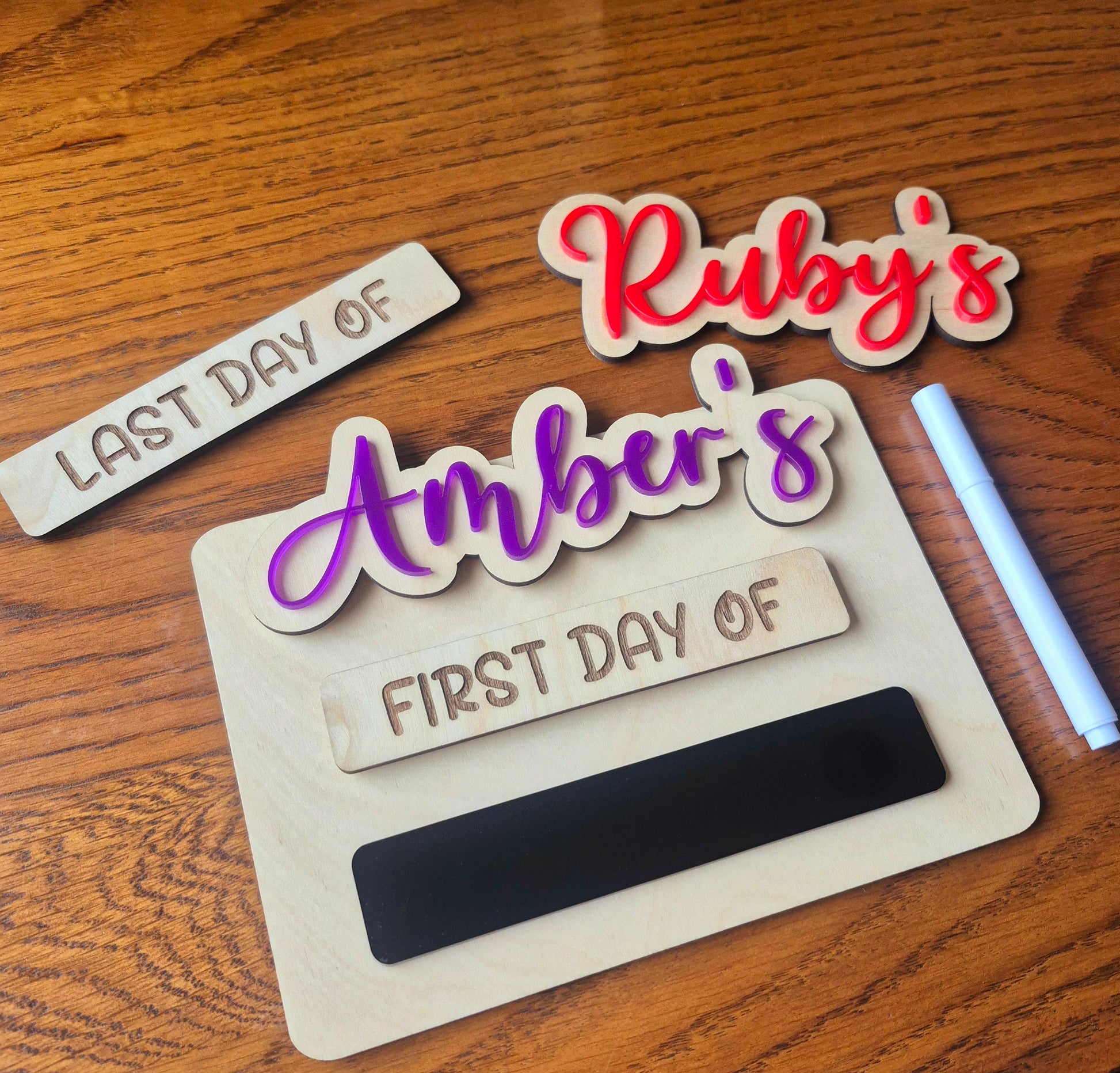 The full set comes ready to use including the board itself, removable name(s), removable first day of and last day of tags, and a chalk pen.