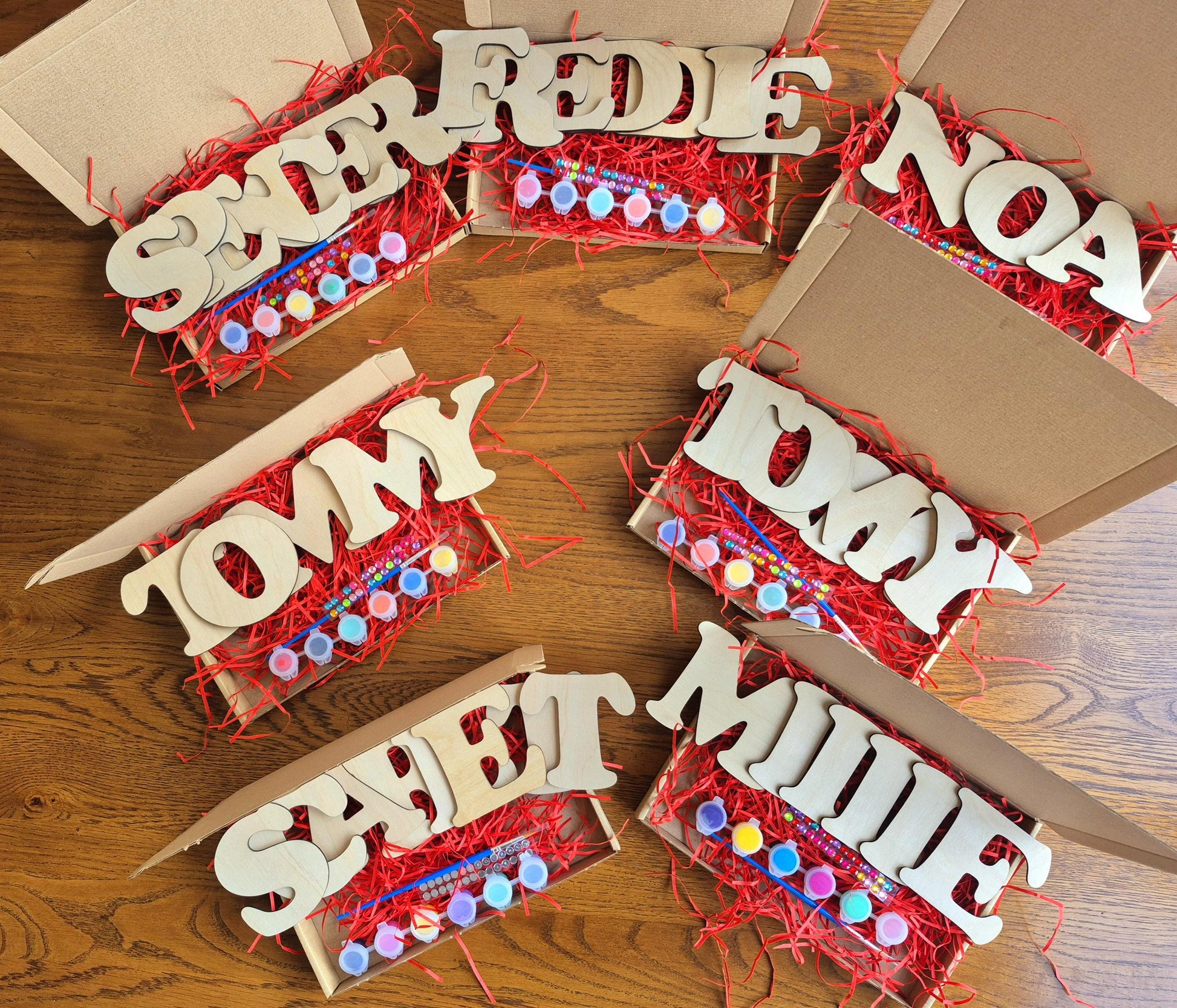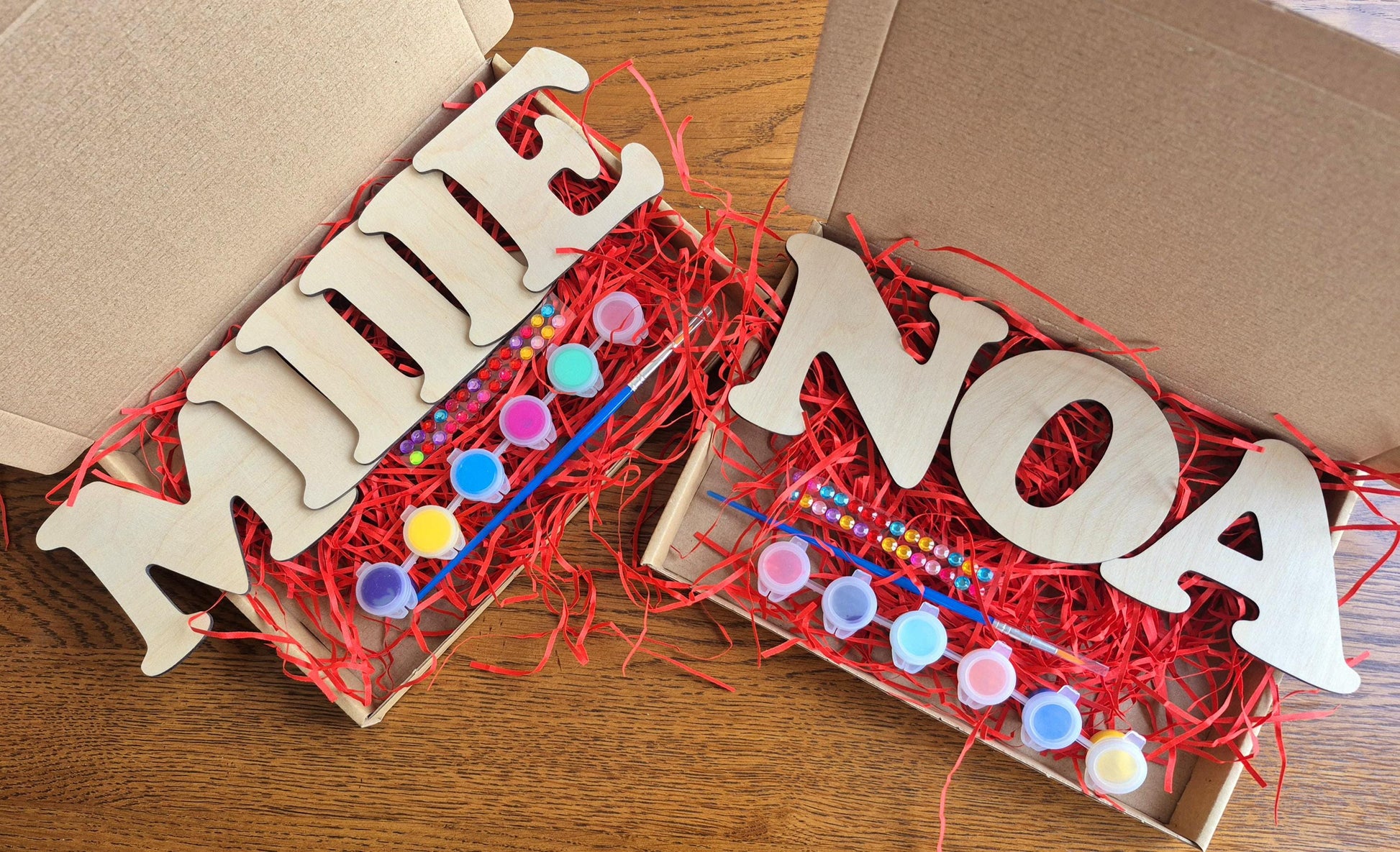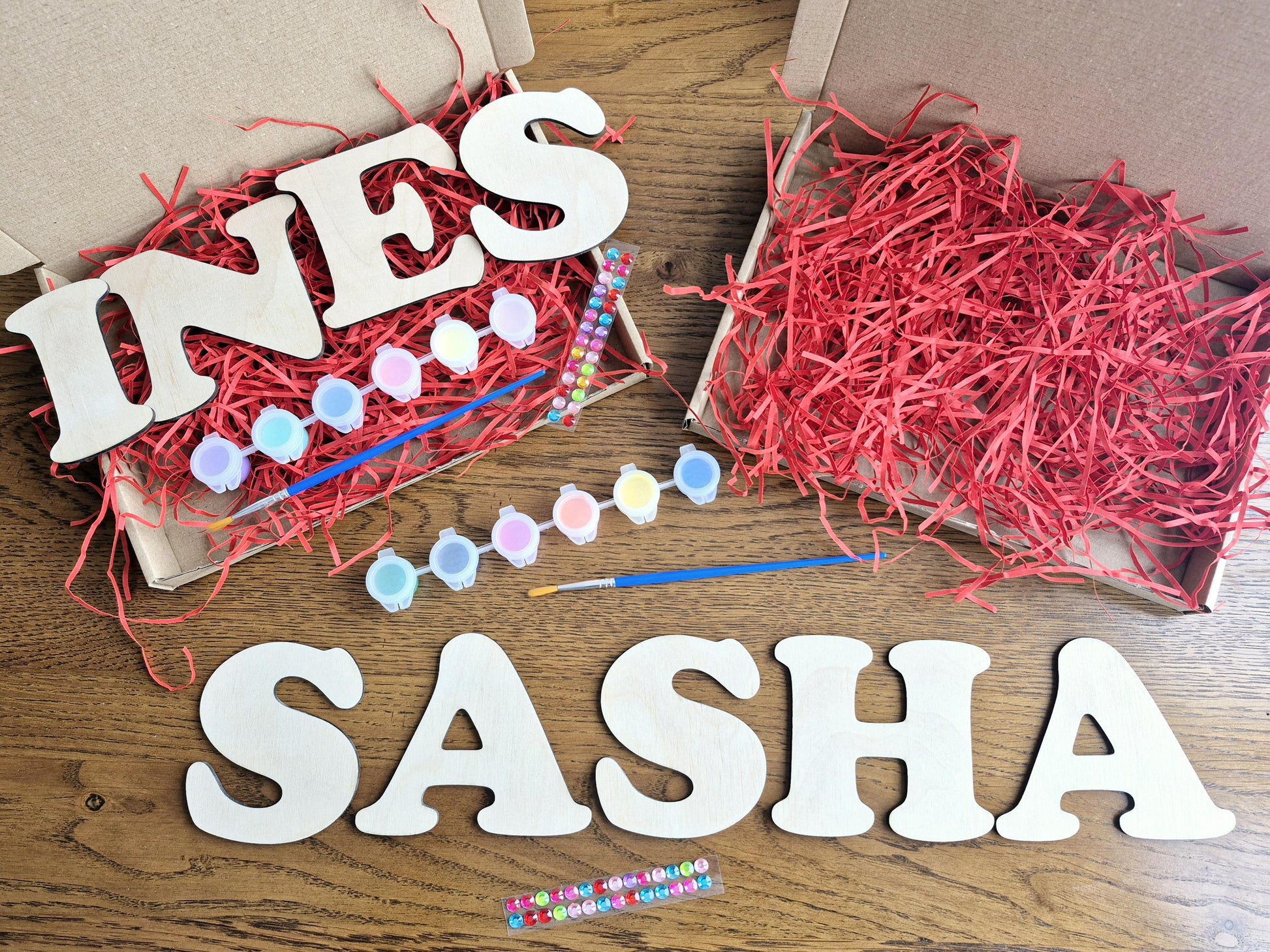 Each set includes wooden letters of name, 6 paints, paint brush and stick on gems.